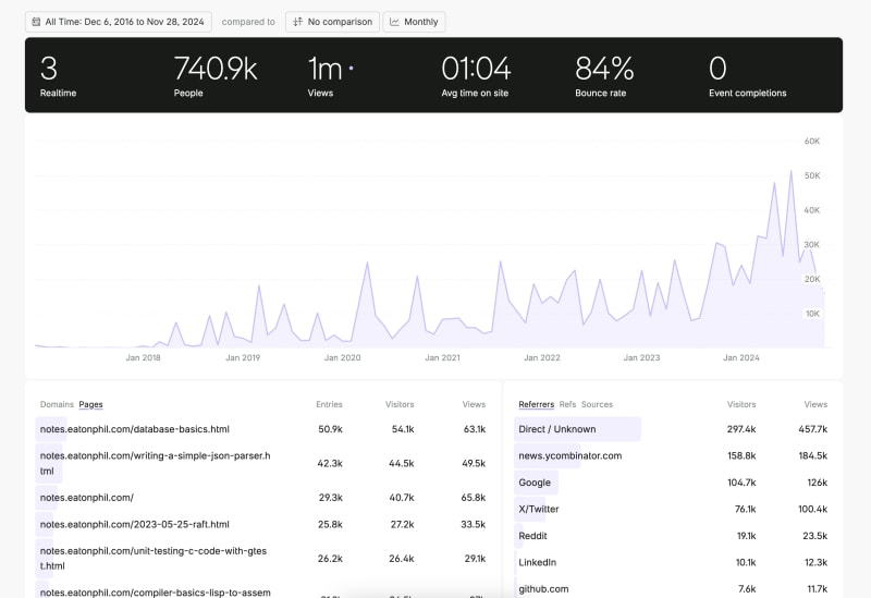 The author celebrates passing 1 million page views on their blog. They started blogging in 2018, focusing initially on JavaScript and Scheme before transitioning to topics like bytecode VMs, emulators, databases, and distributed systems. Their motivation stems from a desire to provide complete, minimal implementations to help