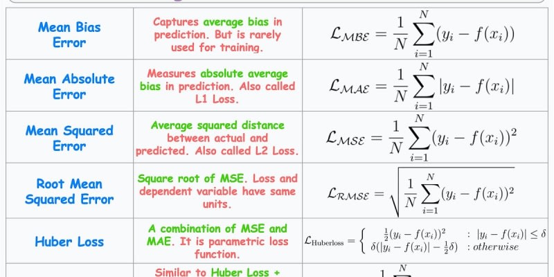 This post highlights the most commonly used loss functions in regression and classification tasks. It covers Mean Bias Error, Mean Absolute Error, Mean Squared Error, Root Mean Squared Error, Huber Loss, and Log Cosh Loss for regression. For classification, it discusses Binary Cross Entropy, Hinge Loss, Cross-Entropy Loss, and