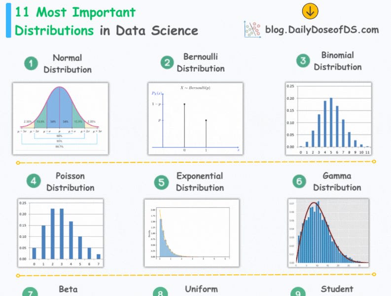 This post covers 11 key probability distributions in data science and explains the concept of maximum likelihood estimation (MLE) for estimating the parameters of a statistical model.