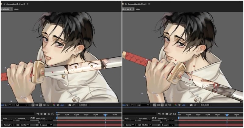 Artist Miu Akatsuki creates impressive 3D-style animations of Jujutsu Kaisen characters using 2D techniques in After Effects. The work demonstrates advanced motion graphics techniques that give 2D artwork a convincing three-dimensional appearance, particularly showcased in character animations featuring Yuta Okkotsu and Choso.