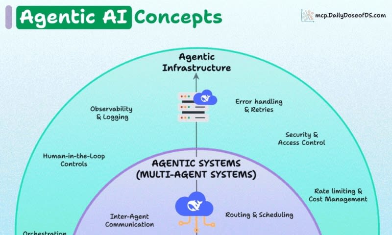 Agentic AI systems are built on four distinct layers: LLMs as the foundation providing tokenization and inference capabilities, AI Agents that add autonomous behavior through tool usage and reasoning, Agentic Systems that coordinate multiple agents through communication protocols and orchestration frameworks, and Agentic