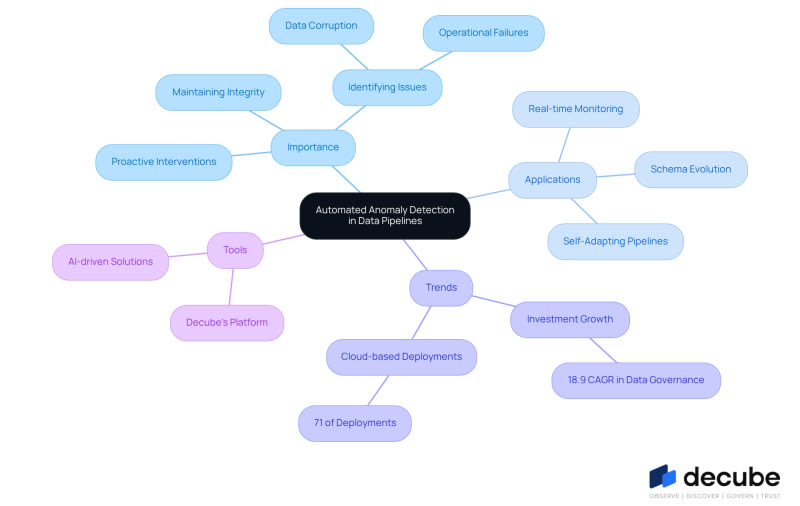 Automated anomaly detection in data pipelines uses ML algorithms and statistical methods to identify unusual patterns, data corruption, and operational failures. Key best practices include: defining clear use cases (financial fraud, healthcare, supply chain), selecting appropriate techniques (Z-score, Isolation Forests, SVM, real-time tools like Datadog/Splunk), integrating detection into existing pipelines with proper data preparation, and continuously monitoring performance via KPIs, audits, and iterative refinement. With 71% of pipeline deployments now cloud-based, investment in data governance is growing at 18.9% CAGR, making automated anomaly detection increasingly critical for maintaining data integrity.