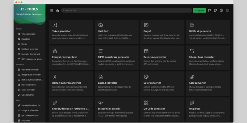 IT Tools is a free and open-source collection of handy online tools for developers & people working in IT. It includes a token generator, case converter, base converter QR code generator, Git cheatsheet, lorem ipsum generator, ... and many more.