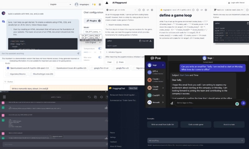 1. Chatbot Arena2. Vercel AI Playground3. GPT4ALL4. Quora Poe5. Chat LLM Hugging Face6. Open Assistant7. Open Playground8. HuggingChat1 Comment
