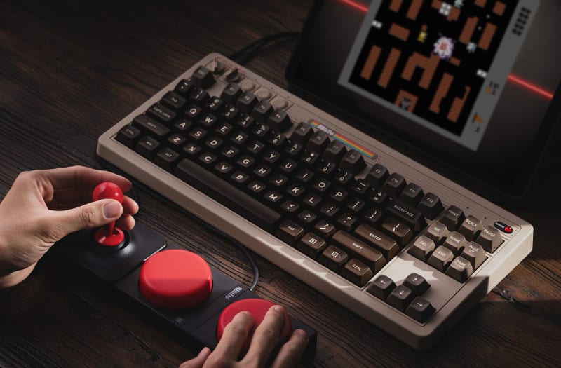 8BitDo has released a new mechanical keyboard that pays homage to the Commodore 64. The keyboard features brown-coloured keys shaped like the original and includes two giant red buttons and a joystick. It can be customized and programmed using the 8BitDo Ultimate Software V2, but this software is not available on Linux. The