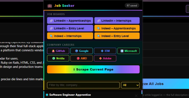 A developer built a Chrome extension that helps with job searching by saving job descriptions and using a local Ollama LLM to rate skill alignment on a 1-5 star scale. Built quickly using Copilot CLI, the tool sorts jobs by relevance and features a neon UI. Currently uses local storage, with plans for future improvements like backend persistence and resume tailoring.