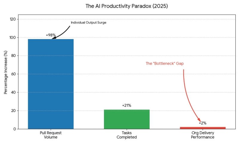 Despite widespread AI tool adoption, most engineering teams see no measurable organizational performance gains. Drawing on 2025 DORA research, METR studies, and data from Faros AI and others, this piece diagnoses why: developers feel faster (expecting 24% speedup) but actually deliver slower (19% longer task times). The root