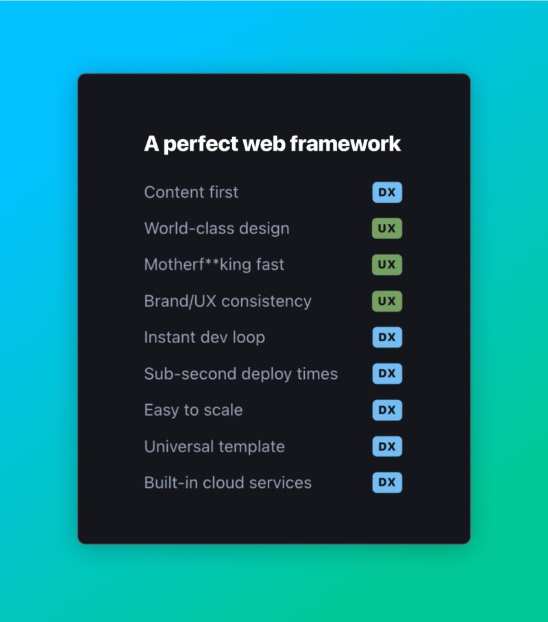 Content-first core DXWorld-class design UXMotherf**king fast UXConsistent MPA+SPA experience UXInstant development loop DXEasy to scale DXSub-second deploy times DXUniversal template DXBuilt-in cloud services DXProduct roadmap24 Comments
