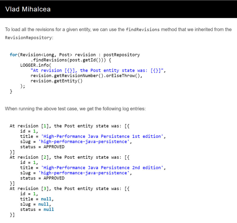 IntroductionDomain ModelSpring Data Envers RepositoriesTracking INSERT, UPDATE, and DELETE operationsLoading revisions using Spring Data EnversLoading revisions using paginationConclusionSort: