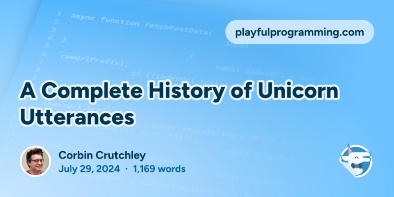 A retrospective timeline of the programming education platform formerly known as 'Unicorn Utterances', now rebranded as 'Playful Programming'. Covers the founding story from 2014 through 2024, including key milestones: the platform's origins on Google+, its launch in June 2019 built with Gatsby, rewrites to Next.js and then
