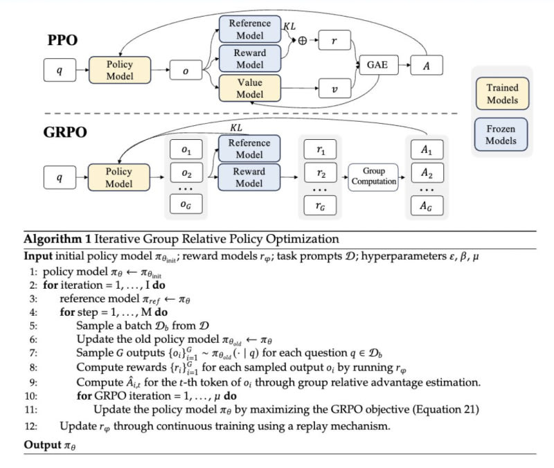 Group Relative Policy Optimization (GRPO) is a novel reinforcement learning method enhancing mathematical reasoning in language models. It simplifies training and reduces memory consumption by eliminating the need for a value function model, using group scores instead. Unlike traditional Proximal Policy Optimization (PPO), GRPO