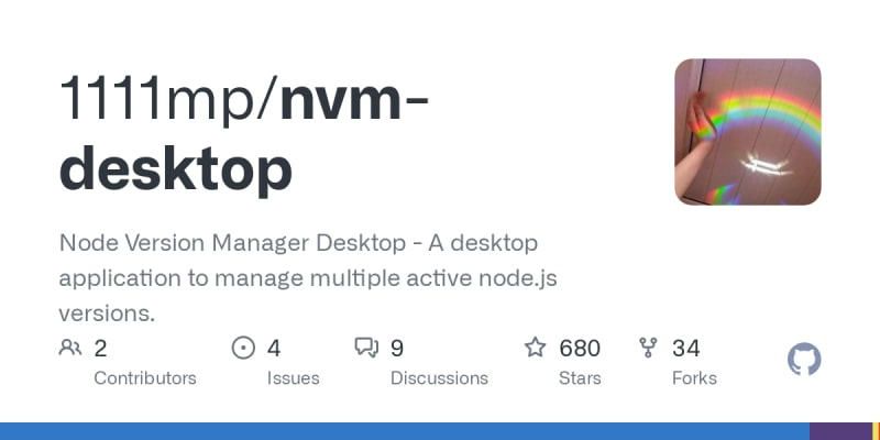 nvm-desktop is a desktop application for managing multiple active Node.js versions, allowing users to quickly install and switch between different versions for individual projects. It uses `nvmd-command`, built with Rust, to intelligently identify the correct Node.js version. The application supports both macOS and Windows,