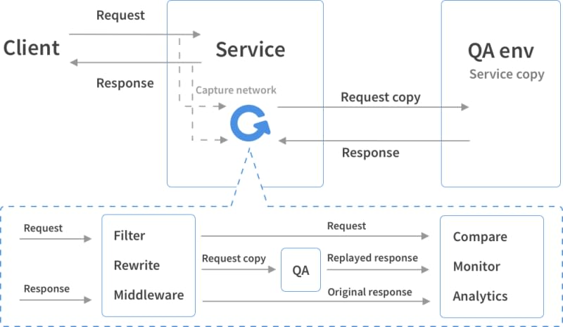 GoReplay is an open-source network monitoring tool which can record your live traffic and use it for shadowing, load testing, monitoring and detailed analysis. As your application grows, the effort required to test it also grows exponentially. This eliminates the risks of putting a third party component in the critical path.