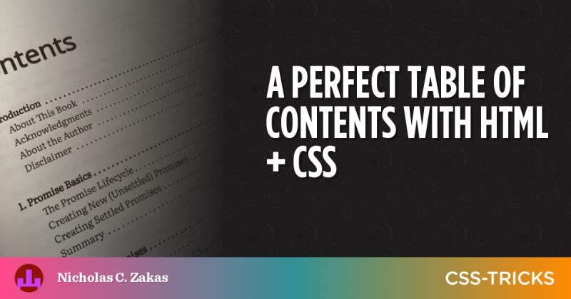 The makeup of a table of contentsChoosing the correct markupApplying styles to the table of contentsStyling the title and page numberCreating dot leadersFinishing touchesConclusionSort: