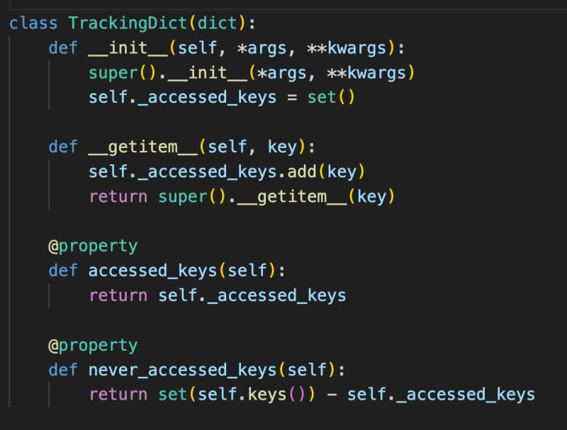 A custom Python dictionary class that tracks which keys have been accessed, helping developers identify unused data fields in their applications. The TrackingDict class extends the built-in dict and maintains a set of accessed keys, providing properties to check both accessed and never-accessed keys. This is particularly useful