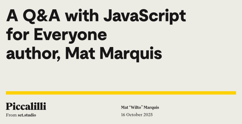 What is it about JavaScript that has you producing so much educational material about it, for so many years? permalinkWhy Piccalilli; why isn’t this just on Udemy/Skillshare/Masterclass/etc? permalinkWhat do you think about the current JavaScript ecosystem, how it’s evolving and what the future looks like? permalinkWhy did you opt for a written course, instead of a video course? permalinkIf you were to give a beginner one piece of advice, what would it be? permalinkAway from JavaScript, what excites you the most about the web? permalinkWhat do you think people will gain from taking the course? permalinkDo I need a good foundational understanding of the author’s pop culture consumption to understand the course content? permalinkMat “Wilto” MarquisSort: