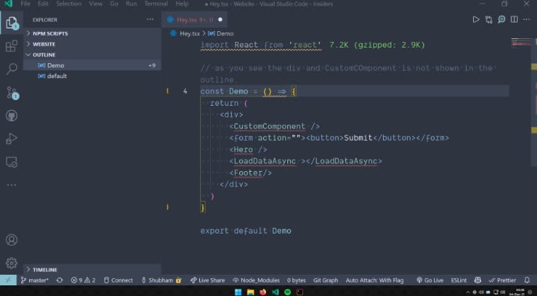React Outline is a simple extension that shows the symbols and outlines for a React file. It can detect custom components and also html tags. I am open for contributions. Head over to the Github repo and make a pull request or raise features requests or issues. If you liked this extensions then check out my other extensions.