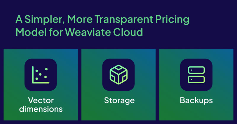 Weaviate Cloud introduces a new pricing model effective October 27, 2025, featuring three pricing dimensions (vector dimensions, storage, and backups) instead of just vector dimensions. The service is rebranded with Shared Cloud (formerly Serverless) and Dedicated Cloud (formerly Enterprise), offering three plans: Flex