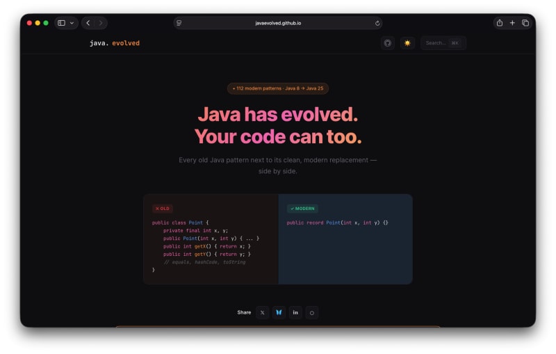 java.evolved is a community site that documents how common Java coding patterns have changed across language versions using side-by-side before/after examples. It targets developers working in mixed-era codebases (Java 6, 8, 17+) by showing how existing code would look if written with modern idioms. Examples include replacing