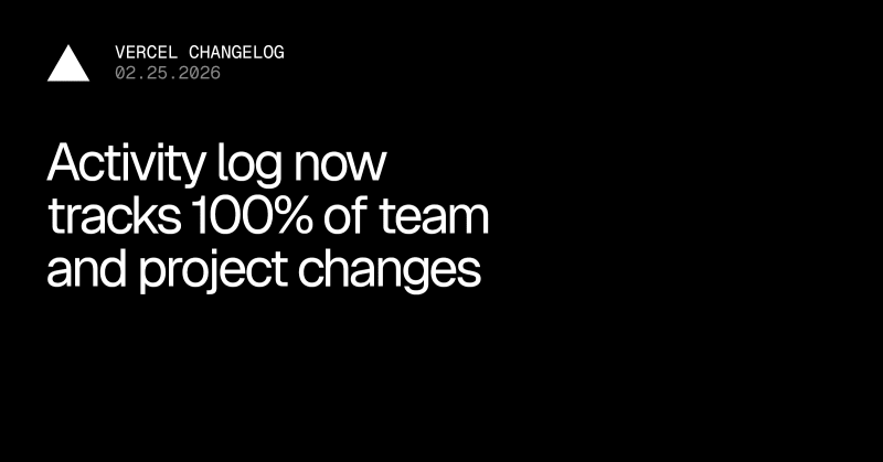 Vercel's activity log now provides 100% coverage of team and project settings changes. With 88 new events added, every action affecting team or project configuration is now recorded, giving teams complete visibility into who changed what and when. Previously, some settings changes went untracked.