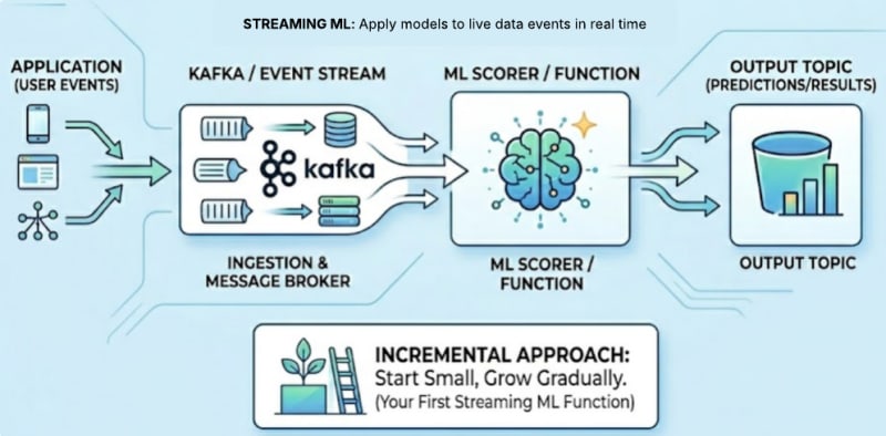 Starting With a Single ML Function (Not a Full ML Platform)What Streaming ML Looks Like in PracticeA 4-Step Flow: Simple, Effective Streaming Architectures for Event-Driven MLStep by Step: How to Add Your First ML FunctionCommon First Use CasesDesign Trade-Offs to Know Up FrontWhat NOT to Do for Your First Streaming ML ProjectHow This Fits Into a Larger ML Platform LaterStart Building Real-Time Inference PipelinesStreaming ML – Frequently Asked QuestionsSort: