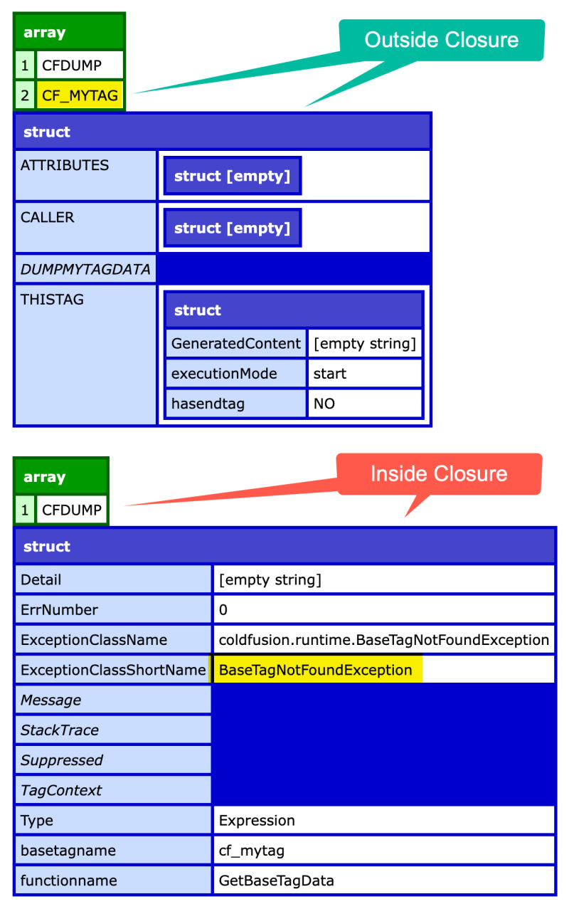A bug in Adobe ColdFusion 2025 causes `getBaseTagData()` to fail when called from within a closure, even an immediately-invoked one that hasn't left scope. The function works correctly in the main control flow but throws an error inside closures, and `getBaseTagList()` also fails to include the parent tag in the hierarchy. This