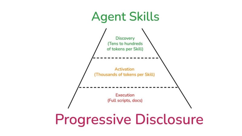 Agent Skills is an open standard released by Anthropic in December 2025 that uses a simple SKILL.md file format to give AI agents modular, progressively loaded capabilities. The format applies the progressive disclosure design pattern to agent context management: at startup only skill names and descriptions are loaded (~80