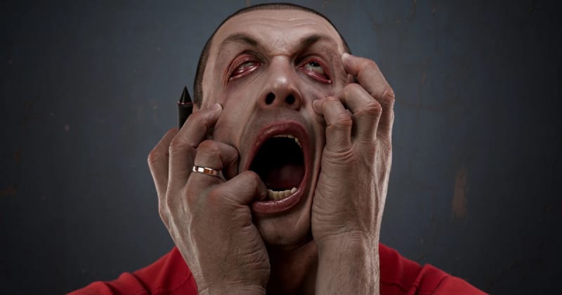 Vladimir Kudryashov created a 3D self-portrait exploring extreme facial expressions and emotional tension. The project focused on realistic facial anatomy, skin deformation, and high-frequency details under dramatic lighting. The head and pore details were fully hand-sculpted in ZBrush, with textures and maps hand-painted.