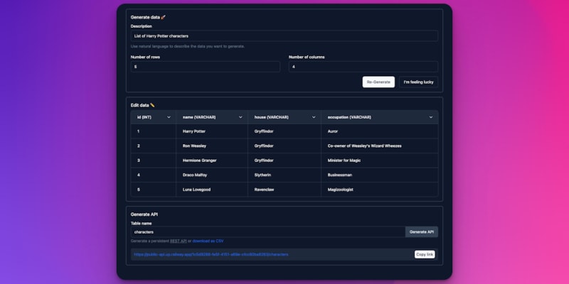 AI-Powered Mock API Generator is a tool that uses GPT to generate a mock REST API backed by a realistic dataset. It allows users to craft the dataset to their needs and plug in the generated API into demos and prototypes for faster development and shipping.