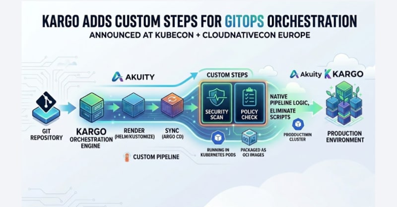 Akuity has introduced a 'Custom Steps' capability to its Kargo GitOps orchestration engine, announced at KubeCon + CloudNativeCon Europe. The feature lets engineering teams define any promotion logic—such as policy checks or security scans—as a native pipeline step using a container-based interface. Each custom step runs in a