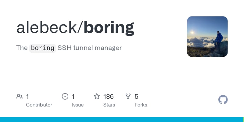 The 'boring' SSH tunnel manager is a simple and reliable command-line tool designed for managing SSH tunnels. It supports both local and remote tunnels, is compatible with SSH config and ssh-agent, and allows automatic reconnection. Configuration is user-friendly via a TOML file, and it supports Unix sockets. Binaries are