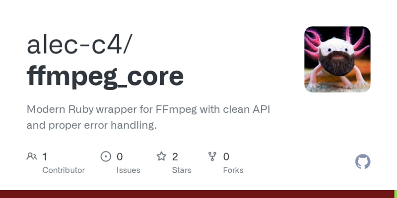 FFmpegCore is a modern Ruby wrapper library for FFmpeg that provides a clean, thread-safe API for video processing tasks. It supports metadata extraction, video transcoding with customizable codecs and bitrates, screenshot generation, and includes comprehensive error handling with specific exception classes. The library