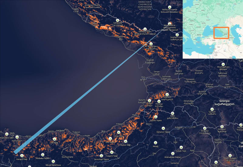 1. Hindu Kush to Pik Dankova (530km) ↗Runners Up2. Antioquia to Pico Cristobal (504km) ↗3. Mount Elbrus to the Pontic Mountains (483km) ↗Explore For YourselfSort: