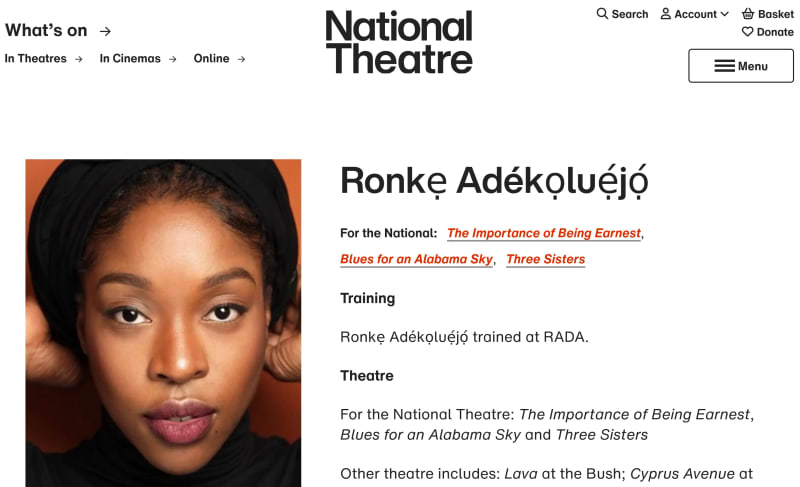 A browser font rendering bug was discovered on the National Theatre website where the name of actress Ronkẹ Adékọluẹ́jọ́ displayed incorrectly in Firefox and Safari but correctly in Chrome. The issue stems from how browsers handle Unicode combining characters when a web font lacks pre-composed glyphs for certain accented