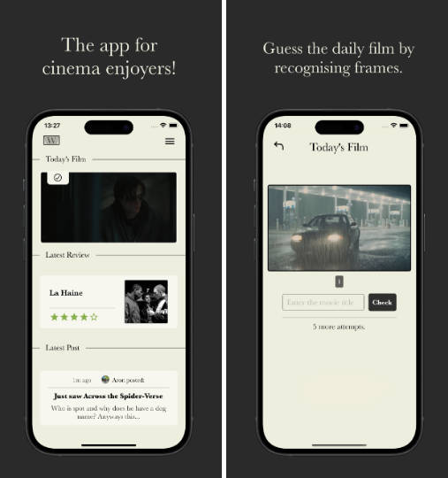 Widescreen is an open-source app for iOS/Android, made for film enthusiasts! Guess and rate the daily film, read nuanced reviews, discuss film with the community, chat privately with friends, and more. Use the React Native Expo environment set on your device.