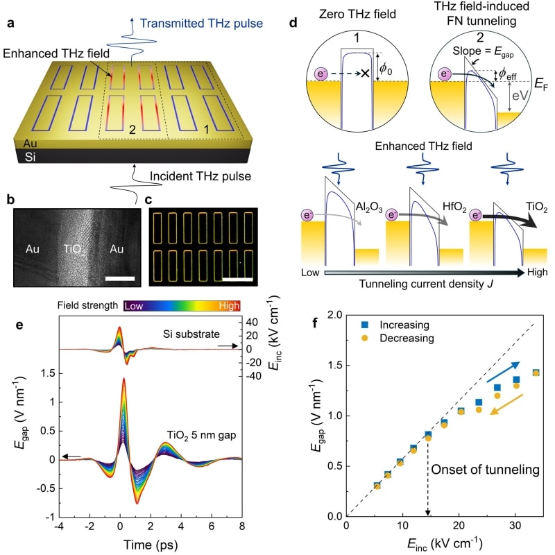 Researchers at UNIST developed a terahertz quantum tunneling device that operates at one-quarter the electric field strength of previous designs by replacing aluminum oxide with titanium dioxide as the insulator material. The device uses quantum tunneling driven by terahertz waves for ultra-fast signal processing, addressing
