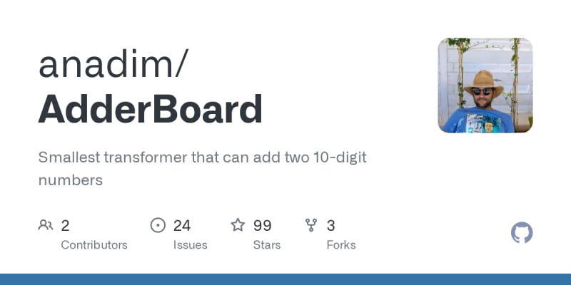 AdderBoard is a community leaderboard tracking the smallest transformer models capable of adding two 10-digit numbers with ≥99% accuracy. Two categories are tracked: trained models (weights learned via SGD/Adam/etc.) and hand-coded models (analytically set weights as constructive proofs). The current record holders are a