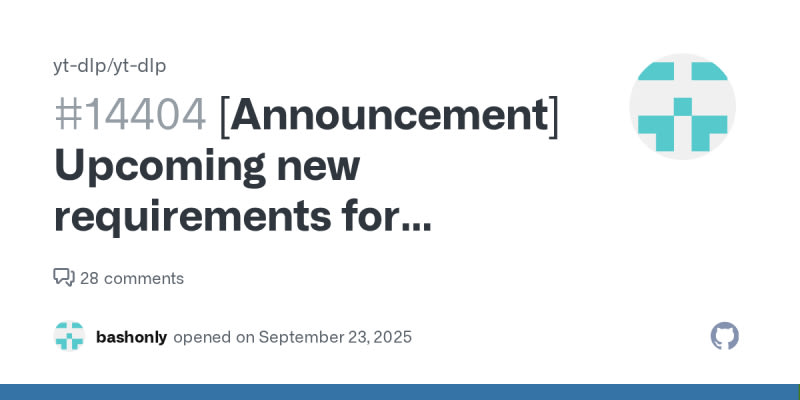 yt-dlp will soon require the Deno JavaScript runtime to continue downloading YouTube videos due to changes in YouTube's JavaScript challenges that make the built-in interpreter insufficient. Users need to install Deno and may need additional setup depending on their installation method - PyInstaller users need no extra action,