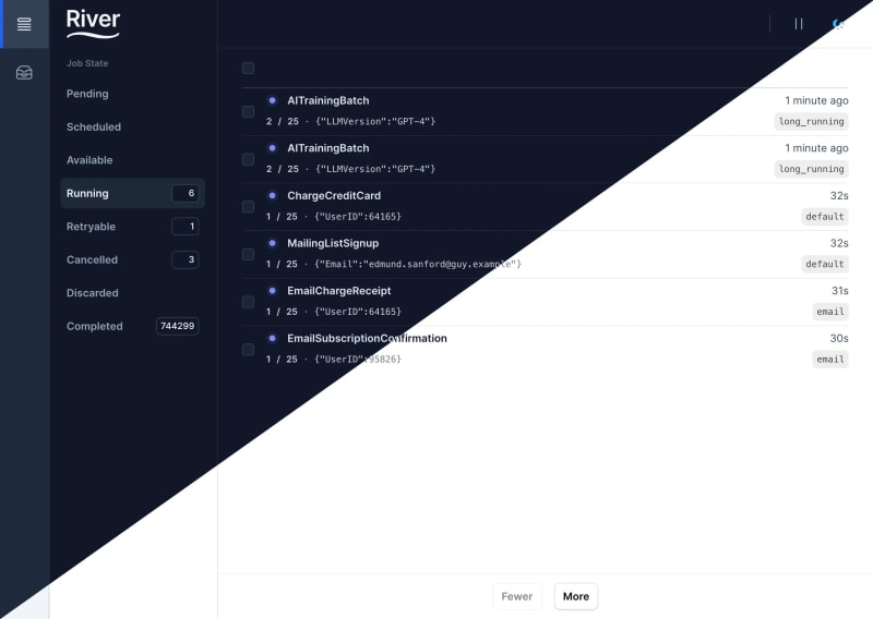 River UI provides a user-friendly interface for managing SQL-backed job queues, featuring a backend Go API and a frontend built with React and TypeScript. It allows users to monitor job states, interact by cancelling, retrying, or deleting jobs, and offers features like pausing queues during issues. River UI is available as a