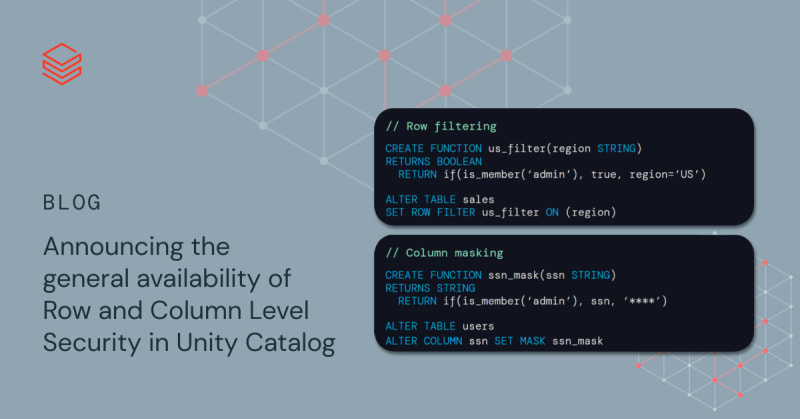 Announcement of the general availability of Row and Column Level Security with Databricks Unity Catalog. Row Filters and Column Masks provide fine-grained access controls on rows and columns in tables, ensuring data security and compliance.