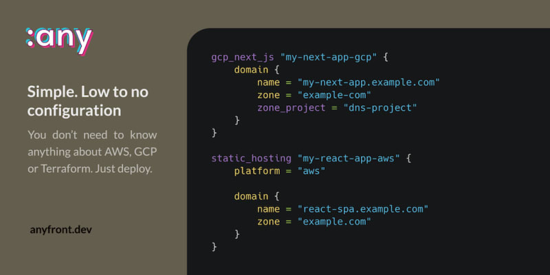 Anyfront orchestrates tools like Terraform, Docker and other CLIs to simplify deploying your React/Next/Svelte/Vue/etc application. Deploy any front-end web application on any cloud platform.