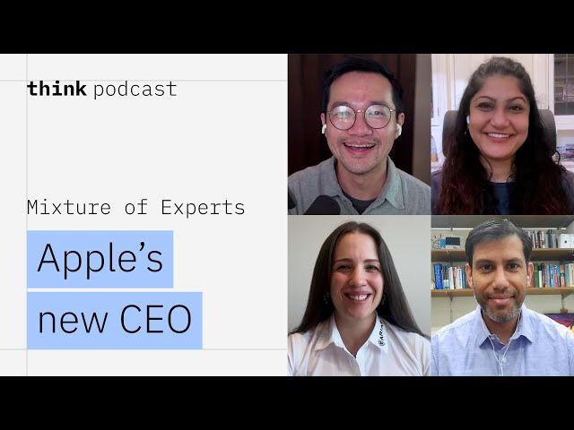 A podcast episode covering four AI and tech news stories: Apple's CEO transition from Tim Cook to John Ternus (a hardware-focused executive) and implications for Apple's AI strategy; Amazon's $5B investment in Anthropic (potentially rising to $25B) with Anthropic committing to $100B+ in AWS cloud services; insights from Adobe Summit on agentic AI orchestration and marketing workflows; and the leak of Anthropic's restricted Mythos model by a Discord group. Discussion touches on on-device vs cloud AI, AI hardware specialization (ASICs vs GPUs), how AI agents are changing consumer purchasing intent and advertising, and the forming of tight cloud-model provider alliances (Amazon/Anthropic, Microsoft/OpenAI).