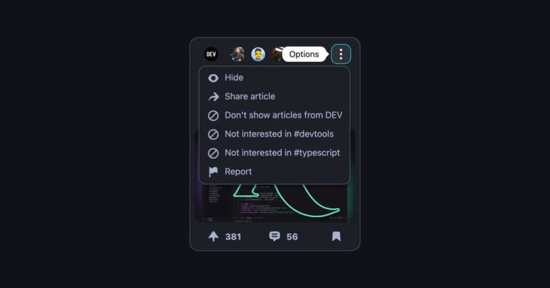 Try it now by clicking on the "Options" button on the card. New context menu allows you to:Hide a cardShare an articleBlock tagsBlock sources. Report (with a whole new UX inside) New "Report" button lets you see all the reports you've reported.