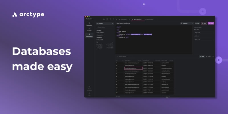 Arctype is a fast, beautiful database GUI for developers and teams. With SQL autocomplete, spreadsheet-style editing, one-click visualizations, collaboration, and the best support for Postgres, MySQL, and PlanetScale - you'll finally love working with your DB.