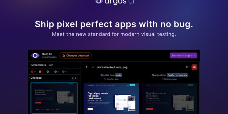 Developer-first visual testing platform Argos first launched on January 1st, 2023. Argos was hunted by Greg Bergé in Open Source, SaaS and Jeremy Sfez. The most active community members Tools Founder Club Amazing deals to kickstart your startup Launch Guide Checklists and pro tips for launching Jobs About us.