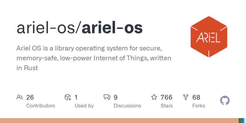 Ariel OS is a Rust-based operating system designed for secure, memory-safe, low-power IoT devices running on 32-bit microcontrollers (Cortex-M, RISC-V, Xtensa). It integrates existing Embedded Rust ecosystem projects like Embassy, esp-hal, and probe-rs while adding OS functionalities including a preemptive multicore scheduler,