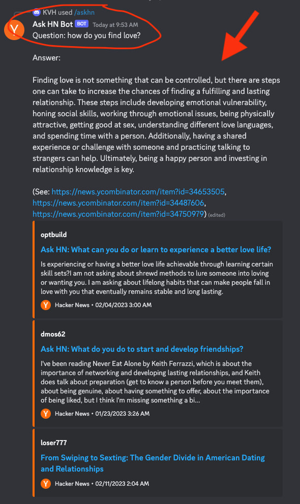 ‘AskHN’ is a GPT-3 bot I trained on a corpus of over 6.5 million Hacker News comments to represent the collective wisdom of the HN community in a single bot. You can query it here in our discord using the command if you want to play around.