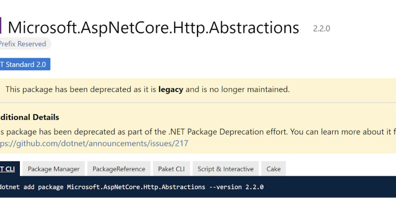 Deprecation warnings for Microsoft.AspNetCore.Http.Abstractions and Microsoft.AspNetCore.Authentication.Abstractions NuGet packages. Solution involves adding a framework reference to Microsoft.AspNetCore.App.
