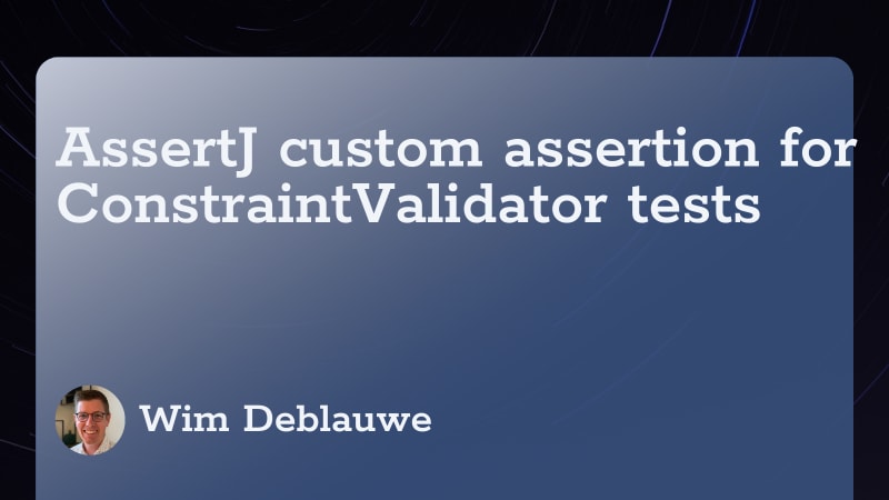 A tutorial showing how to create a custom AssertJ assertion class for testing Bean Validation ConstraintValidators in Java. The post presents a ConstraintViolationSetAssert class that extends AbstractAssert, providing fluent methods like hasViolationOnPath and hasNoViolations to make unit tests for custom validators more readable and expressive.