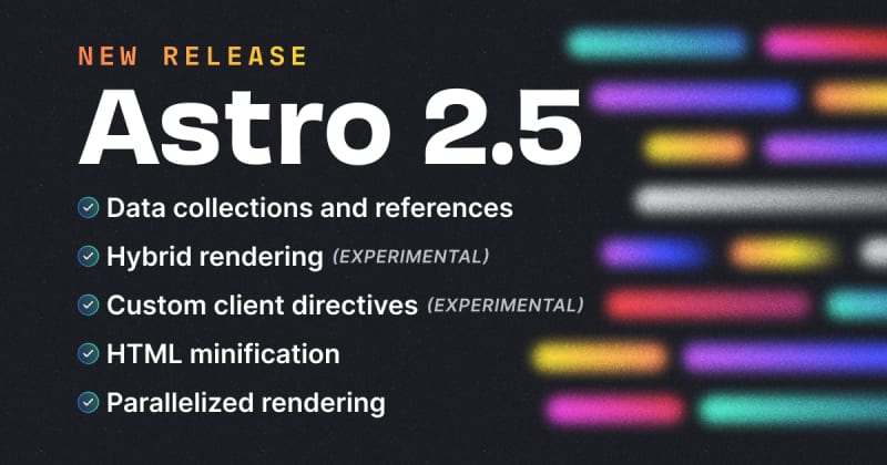 Astro 2.5 has been released with new features including data collections and references, hybrid rendering, custom client directives, HTML minification, parallelized rendering, and a polymorphic type helper.